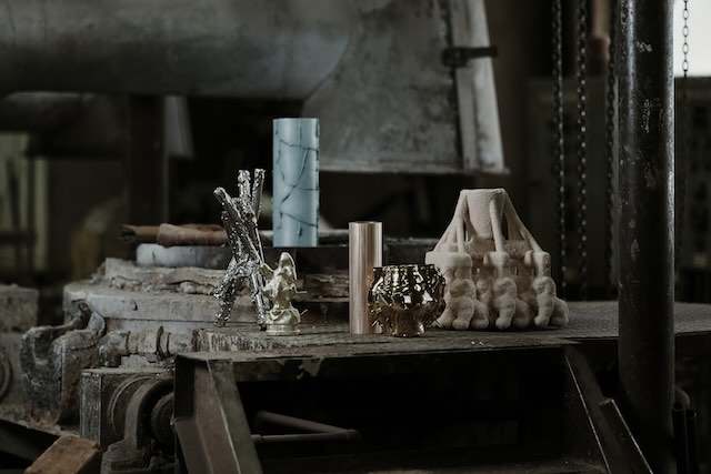 Unseen Objectsは、富山県高岡市の鋳物会社平和合金とデザインスタジオwe+のコラボレーションから生まれたコレクションです。鋳物の製造過程で使用される道具や治具、素材の質感や偶発的な造形など、これまで見過ごされてきた鋳物文化の舞台裏に着目しました。高度な鋳造技術の本質を作品へと昇華することで、鋳造文化の魅力を伝えながら、その価値を再発見、再定義することを試みています。日本で唯一銅器鋳造の伝統的工芸品産地として指定されている高岡市で1906年に創業した平和合金は、ブロンズ像などの大型鋳造からロストワックス鋳造による繊細なアート作品までさまざまな鋳造を行ってきました。本作品では、we+が平和合金の鋳物工場を幾度となく訪ね、鋳造プロセスを丁寧にリサーチすることで、工場で日々生まれる見過ごされてきた魅力にフォーカスします。2025年のMATTER and SHAPE(パリ)、Milan Design Week(ミラノ)にて発表した花瓶のコレクションに加え、新作家具も発表します。