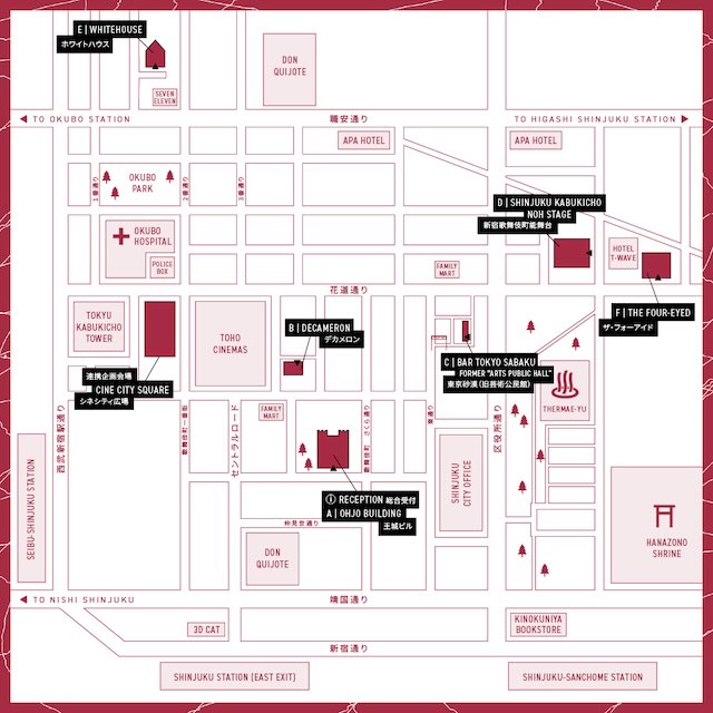 会 場 歌舞伎町地区一帯(王城ビル/歌舞伎町能舞台/デカメロン/WHITEHOUSE/東京砂漠(旧芸術公民館)/THE FOUR-EYED ほか)(東京都新宿区歌舞伎町)