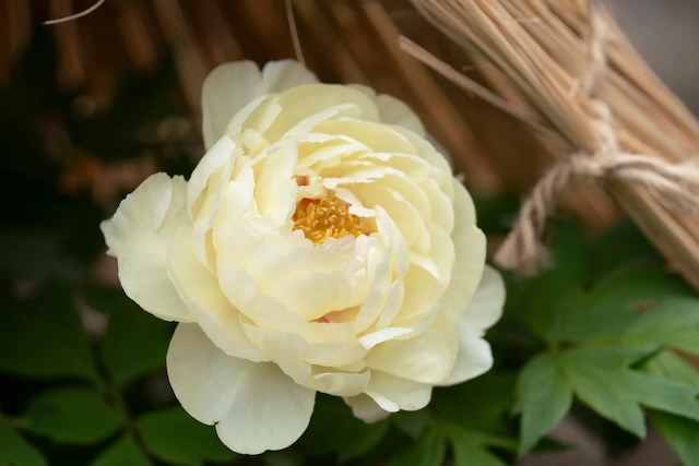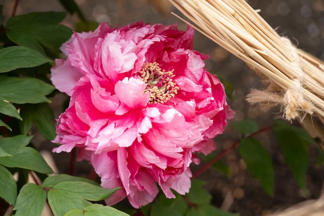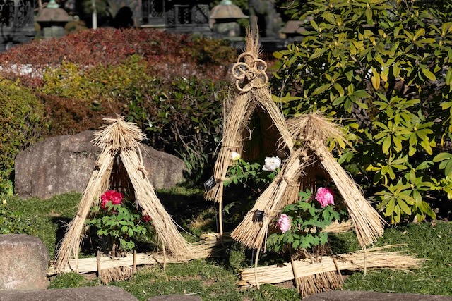 冬の厳しい環境から保護するため、開苑中の冬咲きぼたんは「わらぼっち(薬囲い)」に包まれています。当苑では開苑当時から荒縄を用いた男結びや梅などのお花を模した飾り結びで見る人の目を楽しませています。