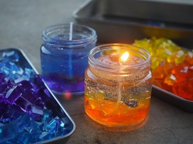 透明なジェルワックスのキャンドルを作ります。菜の花や桜の花の形のガラスパーツを選んでジェルの中に閉じ込めます。