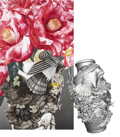 当館が所蔵する最大級の眞葛焼「崖ニ鷹大花瓶」の等身大(約52cm)3Dプリントを展示。その大きさのため、無彩色の3Dレプリカですが、その迫力は抜群!
