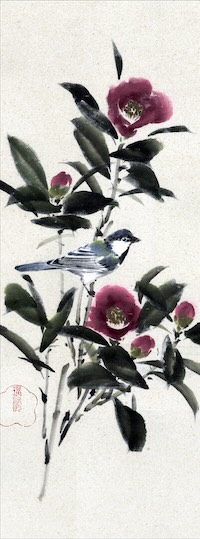 - 『雪椿に四十雀』墨 顔彩 和紙 62×23cm