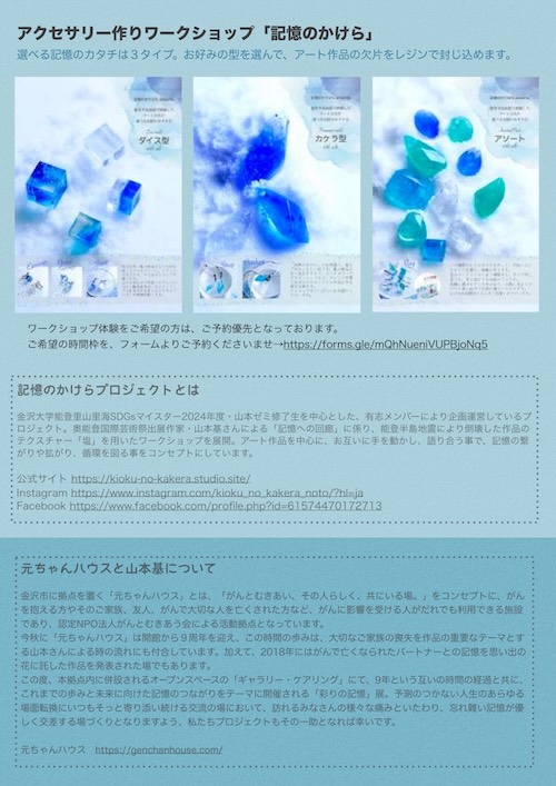 当日は「選べる記憶のカタチ」と題した様々なモールド(型)に、能登半島地震で倒壊した山本基さんの作品「記憶への回廊」(作品所在地=石川県珠洲市内旧小泊保育所/奥能登国際芸術祭出展作品)の作品の根幹である「塩」の結晶をレジンで封じ込めるアクセサリー作りを体験して頂くワークショップとなっております。