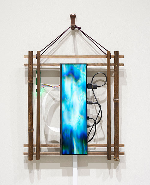 ディスプレイの作品では、映像作品を日本文化のなかの掛軸を想起させる細長いディスプレイに組み込み、茶道具としての映像を制作しています。