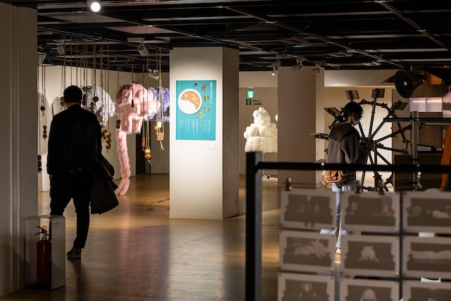 会場では、迫力あるメインビジュアルやフロアマップをはじめとした展示空間の装飾を、卒業・修了展全体のコンセプトに基づき統一感のあるデザインで構成しています。
