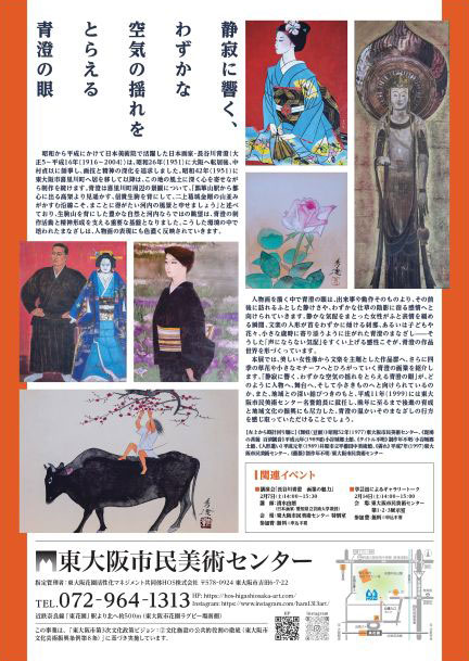 本展では、美しい女性像から文楽を主題とした作品群へ、さらに四季の草花や小さなモチーフへとひろがっていく青澄の画業を紹介します。「静寂に響く、わずかな空気の揺れをとらえる青澄の眼」が、どのように人物へ、舞台へ、そして小さきものへと向けられているのか、また、地域との深い結びつきのもと、平成11年(1999)には東大阪市民美術センター名誉館長に就任し、晩年に至るまで後進の育成と地域文化の振興にも尽力した、青澄の温かいそのまなざしの行方を感じ取っていただけることでしょう。