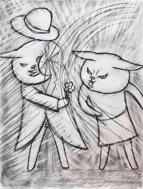 田島享央己が、線の世界に遊ぶ。その筆致は軽やかで奔放ながら、どこか律儀に構築されています。画面に現れるのは、パンツから何かがこぼれ出た動物たち、仏頂面でタクシーを呼ぶウサギ、帽子をかぶった紳士風の猫──いずれも一見ユーモラスでありながら、じっと見るほどに得体の知れない静けさを湛えています。
