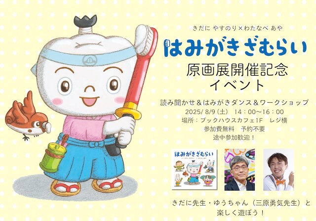 きだにやすのり先生による『はみがきざむらい』読み聞かせ、ゆうちゃん(三原勇気先生)による創作ダンス「はみがきダンス」、オリジナル『はみがきざむらい』缶バッジ作り、オリジナル「ブラシ丸」作りです。参加費無料、予約不要、途中参加も可能です。