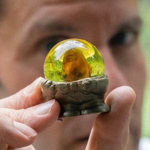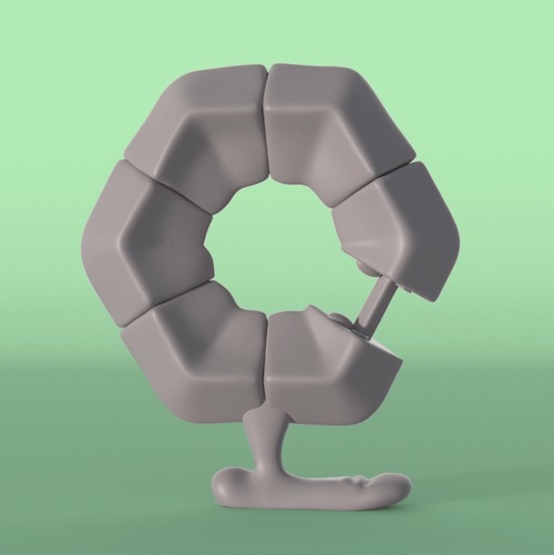 各作品タイトルとしましては、《You might not like it, but we’re all connected》(2025)があります。本作品は、自然界に多く見られる六角形を基調とし、イモムシのような姿の両端がつながり、無限を象徴した輪となっています。六角形は雪の結晶や昆虫の複眼、蜂の巣、土星の北極など、極小から惑星規模まで現れる自然の形です。途切れない輪は自然界の循環も象徴し、向かい合う二つの顔は同時に存在する異なる感情を示唆しています。