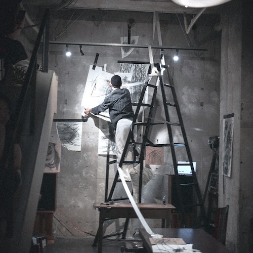 美術家 ASUKI × 音楽家 hofli / TakashiTsudaによる即興パフォーマンス「ふれあう面、とけあう線」