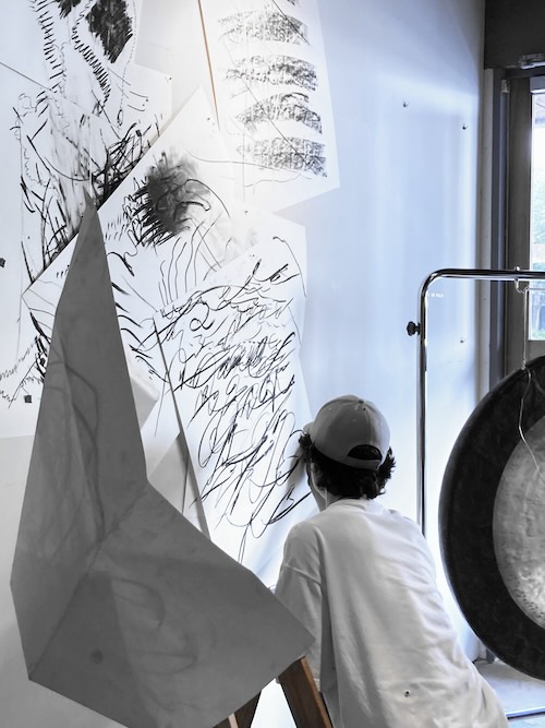 マチネでは、ドローイングと演奏が連歌のように交互に呼応しながら進行します。その対話によって立ち上がる「ふれあう面、とけあう線」。パフォーマンスの最後には、その痕跡として生まれた絵画作品が壁面に展示されます。