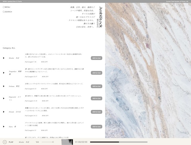 環境音楽を主としたロイヤリティフリーの音源ライブラリサービス「AmbiStock MUSIC」を2026年1月8日(木)にリリースします。全音源が統一価格・商用利用可能・買い切りの永続ライセンス(サブスクリプションなどの登録も不要)を特徴としており、映像制作・空間演出・インスタレーション、あるいは集中・睡眠・瞑想・ヨガといった個人利用など、様々な用途で自由に使うことができます。