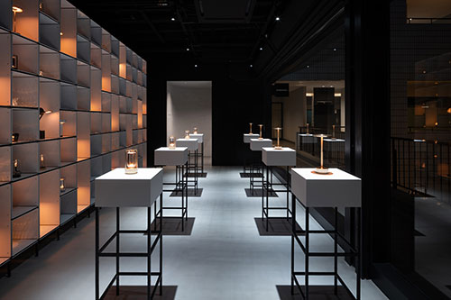 建築家の鬼木孝一郎が手がけました。吹き抜けに面したガラスエリアにはオリジナルのモジュール什器を採用し、製品展示スペースとして設計されています。また、バーカウンターやダイニングテーブルを配置し、実際の使用シーンを体感できる空間となっています。