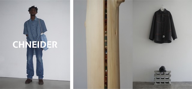 会場では、ファッションブランドCHNEIDERの作品と、彫刻家・高山瑞の作品が同じ空間で共存します。かつて自然界で風に揺れていた植物、木も麻も、その原初の景色が、姿を変え会場という新たな風景に広がります。