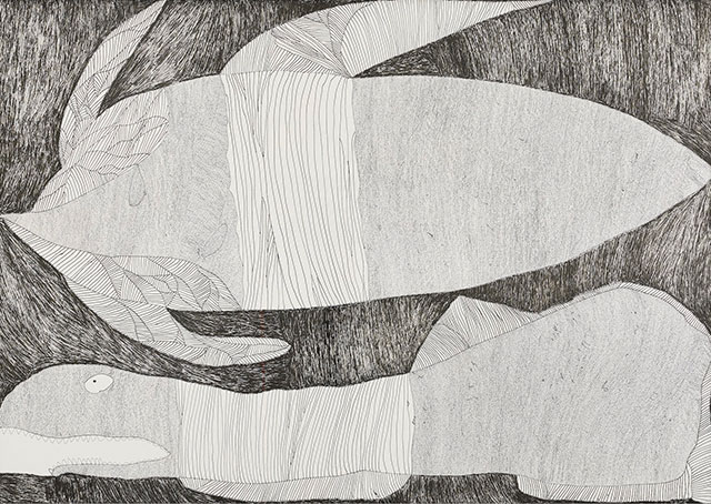ペンを用いて人物や動物など、モチーフが決まると彼独自の視点で余白を余すことなく、紙面全てにゆっくりと描きこんでいく。彼の内向的で真面目な性格が作品にも反映され描く線の一つひとつがとても丁寧で、まるで細い糸が絡み合っているかのように繊細に描かれる。日常では、ほとんど言葉も発することなく意見を求めても、顔を赤らめながら、か細い声で一言口にする程度しかない彼の作品からは、内に秘めた思い全てが放出され、訴えかける力強さに満ち溢れている。彼もまた自己を表現する術を作品制作に見出した1人であり、これからも彼の世界観は大きく広がっていくだろう。