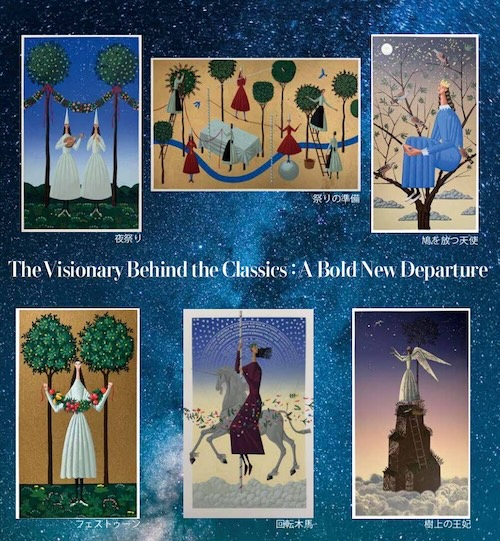 本展では、箔を使用した新たな試みで初披露する新作ジクレーは必見です。コンセプトを「The Visionary Behind the Classics :A Bold New Departure」と銘打ち、装画で多くのベストセラー作家を支えてきた北見氏の新たな出発を作品を通して表現します。星空や月、ユニコーンや天使といった象徴的なモチーフが、北見氏独自の緻密なタッチと豊かな色彩で描かれます。