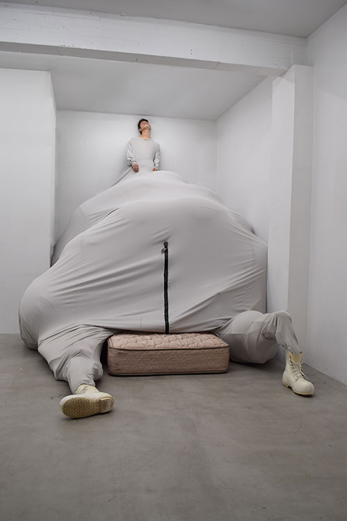 服が身体に与える影響に興味があり一部を巨大化させた服を用い、そこに他者の体を取り込んでパフォーマンスを行う。