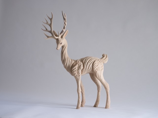 本展は、木から動物を彫り出す土屋氏、糸や布から空想植物を創るアフロプリュスの皆川氏、植物の命を織りなすアトリエシムラという、自然への畏敬を共通項に持つ三者による初の試みです。春日大社の鹿島立ち伝説に着想を得た新作の木彫作品やアクセサリーなど、この場だけでしか出会えない「斎庭(神聖な庭)」を表現します。