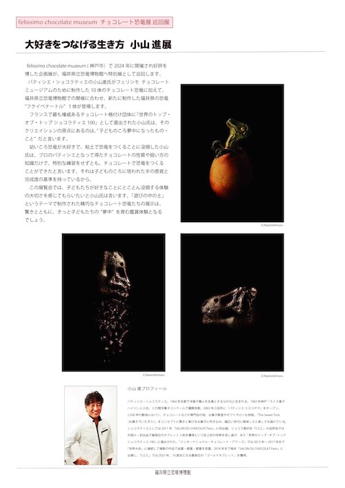 福井県立恐竜博物館は、2025年12月19日(金)から2026年2月23日(月・祝)まで、トップショコラティエの小山進氏が制作したチョコレート恐竜を展示する企画展「大好きをつなげる生き方 小山進展」を開催します。