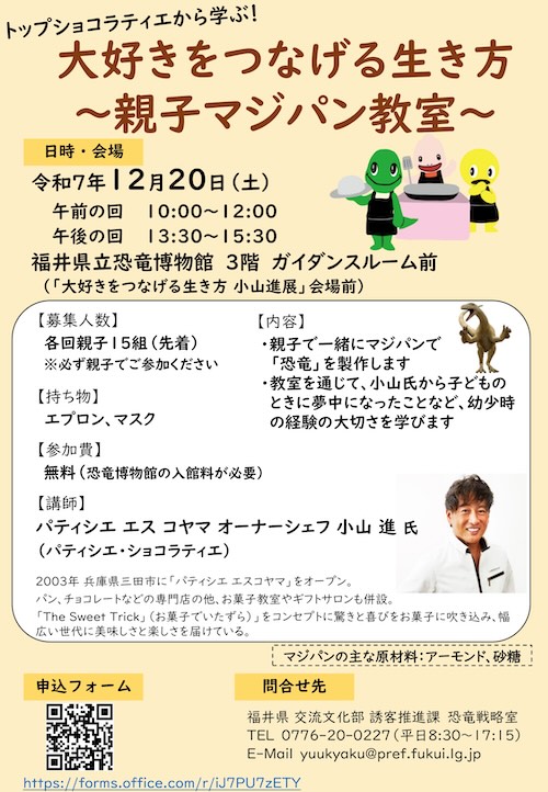 2025年12月20日(土)には、小山氏によるワークショップ「大好きをつなげる生き方~親子マジパン教室」を開催します。親子でマジパンを使って「恐竜」を制作するほか、小山氏から子どものときに夢中になったことなど、幼少時の経験の大切さを学びます。教室は事前申し込み制で、すでに定員に達しています。