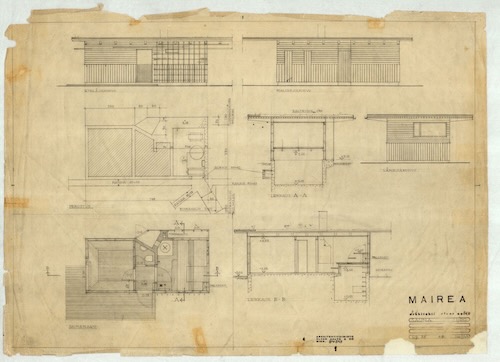 - サウナの平面・立面・断面図 作図=アルヴァ・アアルト、1938、アルヴァ・アアルト財団蔵