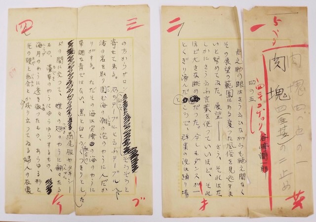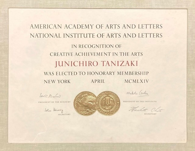 この他、師と仰ぐ先輩文豪永井荷風に宛てられた、敗戦時の二人をめぐる有名なエピソードを導いていく谷崎の手紙や、なぜかバラバラに裁断された小説原稿、家族思いの谷崎の一面が垣間みられる馴染みの医師への書簡、文豪最晩年の栄誉を輝かしく縁どる日本人で最初に授与されたアメリカの文芸アカデミーの会員証等々、ニュー・フェースたちは、多士済々です。特設展では、そのそれぞれの魅力、秘められた物語、一筋縄ではいかない個性を、存分にアピールしていただきます。