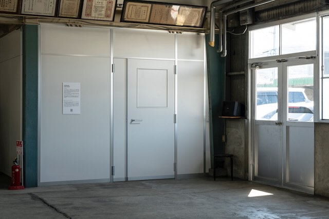 - 小宮太郎 <<少しだけ開いた扉>> 2024 マスキングテープ カモ井加工紙の食堂の壁 Photo by Yuki MORIYA