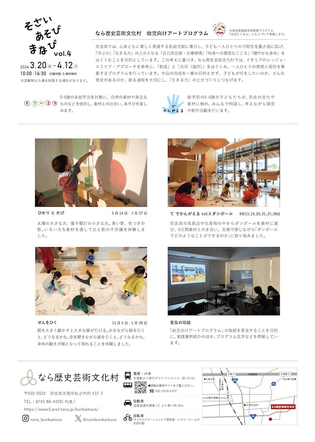 この考え方に基づき、なら歴史芸術文化村では、イタリアのレッジョ·エミリア·アプローチを参考に、「創造」と「共同(協同)」をはぐくみ、一人ひとりの発想と個性を尊重するプログラムを行っています。