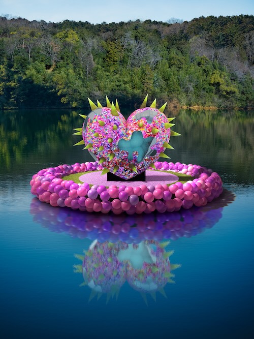 1. 「棘で守られたハート」の巨大なアート作品、ピンクの島が宮沢湖に出現!「KAWAII-CORE ISLAND(カワイイコア アイランド)」