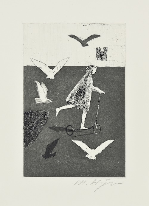 1970年代後半からは自身の子供の誕生をきっかけに人物を描きはじめ、幼い我が子の姿を参照した少女が描かれた一連の作品の多くは「アンリエットの回想」と名づけられました。「今、僕の絵に少女が多く登場するのも未知数なものに心ひかれるからなんです。そして絵にしても同じですが、完成する前の状態で完成した作品にしたい」と語る画家にとって、彼女たちは境界的な存在(大人/子供、接地/浮遊)であると同時に、決まったスタイルにとどまることなく、不断の飛翔を追い求める画家の芸術理念が仮託されています。
