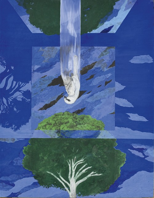 1970年前半、北條は「夏」シリーズと称し、青の色面と若々しい樹木を組み合わせた、爽快な印象の作品群を手がけます。シュルレアリスムの代表的な画家ルネ・マグリットの作品に魅了されたと語るとおり、空に浮かぶ巨大建造物の幻想的なイメージにはその影響がみられます。