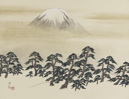 東京美術学校の第1期生。1937(昭和12)年制定の文化勲章第1回受章者となり、1951年に文化功労者。生涯を通じて富士山を主題とした絵を2000点以上描く。《霊峰不二》は手前に三保の松原、奥に冠雪の富士山を配する。