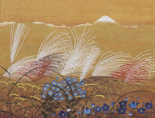 富士吉田市にアトリエを構える洋画家。《錦秋》は御坂峠から見える、紅葉に囲まれた冠雪の富士山と、河口湖に映る逆さ富士を描く。画家本人は「富士吉田市に住み57年、毎日富士を仰ぎ、畏敬の念を持って富士と共に生活している」とコメントを寄せる。