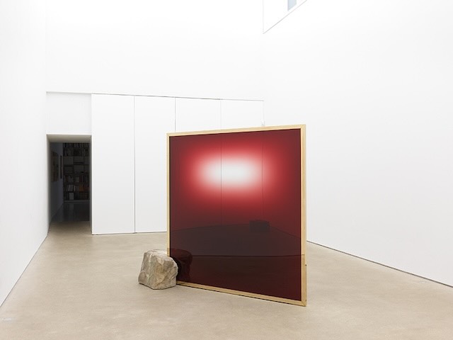 - 和田礼治郎 《スカーレット・ポータル》 2020年 ワイン、強化ガラス、真鍮、ステンレススチール、大理石 180×220×60 cm 展示風景:「Embraced Void」ダニエル・マルツォーナ(ベルリン)、2020年 撮影:Nick Ash