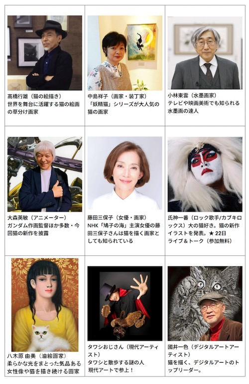 主な出品作家として、水墨画家の小林東雲氏、アニメーターの大森英敏氏、妖精猫作家の中島祥子氏、猫分野の代表的作家である高橋行雄氏、油絵画家の八木原由美氏、現代アーティストのタワシおじさん氏、デジタルアーティストの國井一色氏、ロック歌手でイラストも発表する氏神一番氏、女優で画家の藤田三保子氏らが名を連ねています。